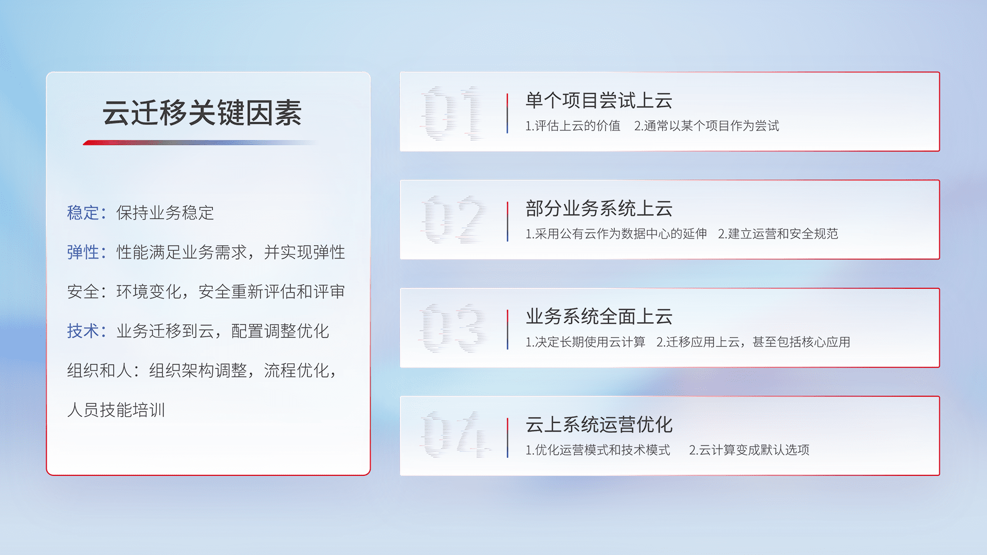 结合实际业务,,,,从规划设计、、、云平台选型、、、、云原生改造、、数据迁移、、集成交付,,,迁移全过程为客户识别最佳上云路径,,,,做好风险识别管理,,设计网络架构、、身份权限、、、安全审计合规、、、、操作审计、、日志审计、、监控告警策略、、、、多站点容灾设计等,,,,对云上基础设施进行整体规划,,提升IT治理水平,,以满足弹性、、、高可用、、高性能的需求。。。