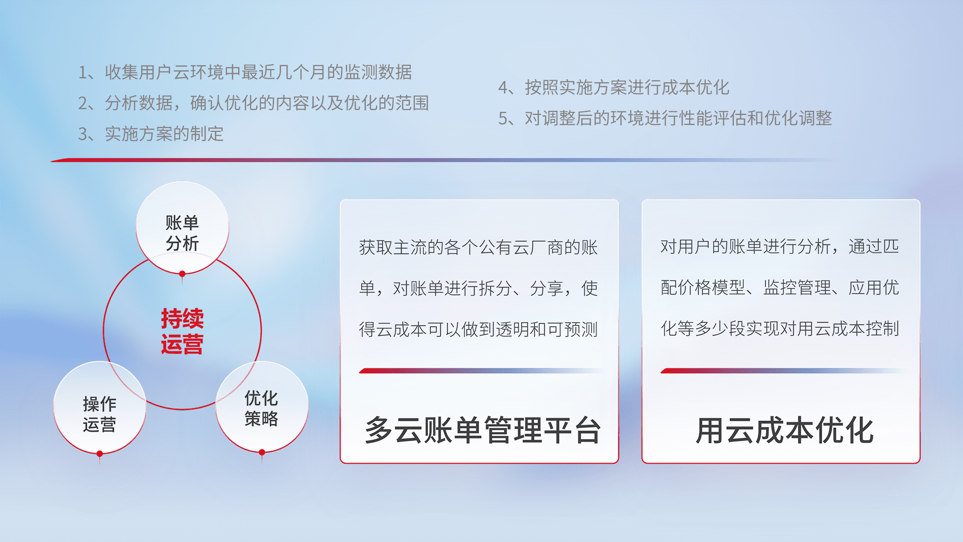 通过多云纳管,,以统一的资源数据模型把客户的云资源进行抽象和封装,,,进而实现对多云资源的统一操作,,保障云资源管理的可靠性、、稳定性与可用性。。。量身定制化运维内容,,,,配置、、、、开发运维、、、补丁管理、、、备份、、监控、、认证和访问管理、、、审计和日常巡检等,,保障在用云过程中的可靠度,,,稳定度以及高可用率。。。。