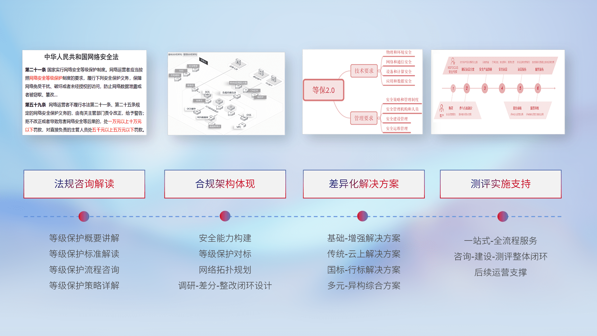 通过专业的法律咨询解读、、、合规架构体现、、差异化解决方案、、测试实施支持等服务,,,,为客户量身打造等保合规体系。。。